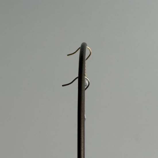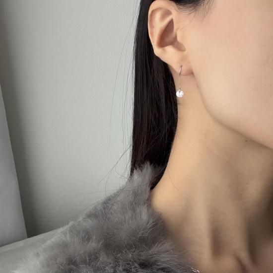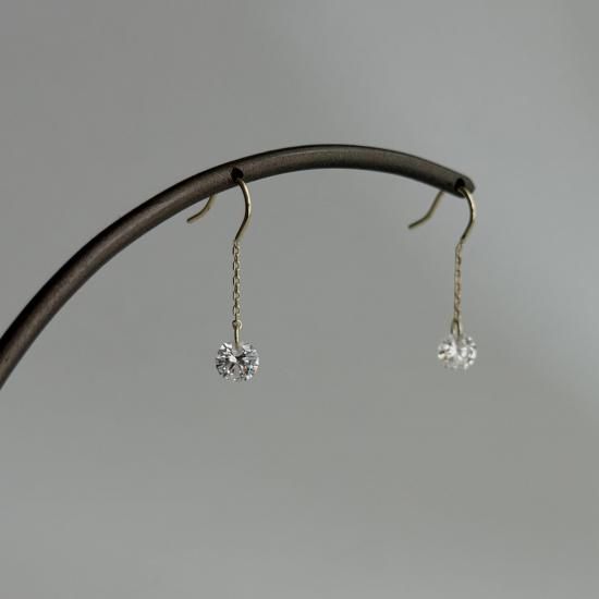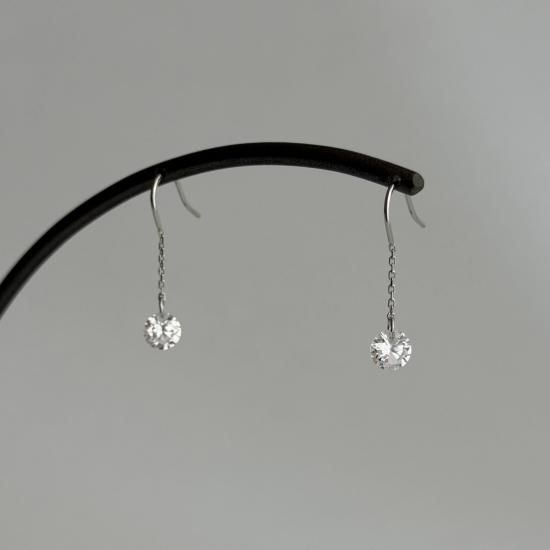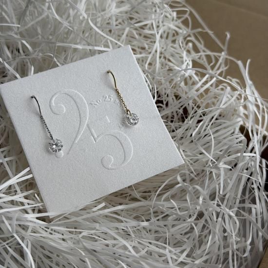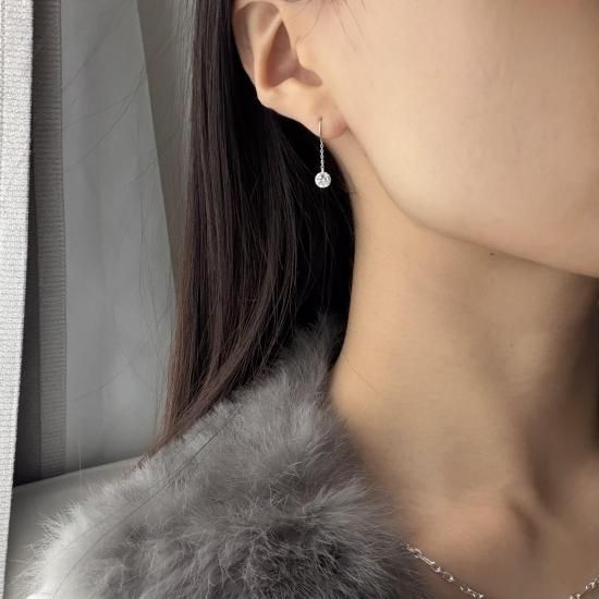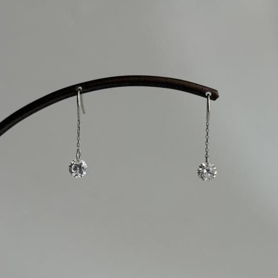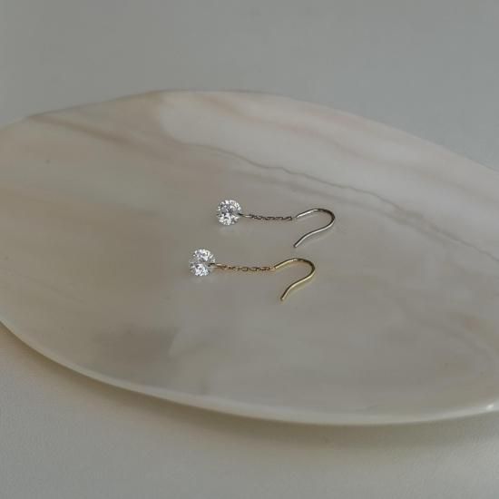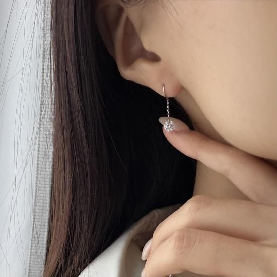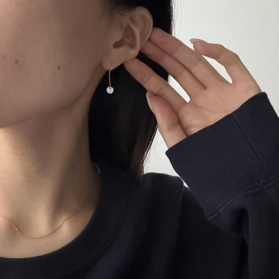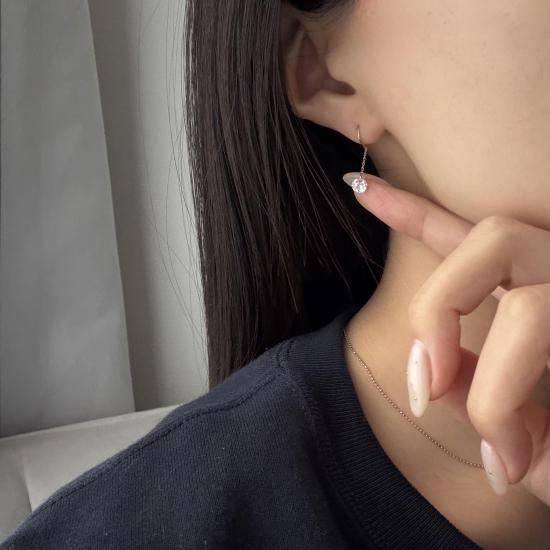 繊細なチェーンの先で、ストーンがきらめくドロップピアス。動くたびに光を受けて揺れ、顔まわりを明るく引き立てます。